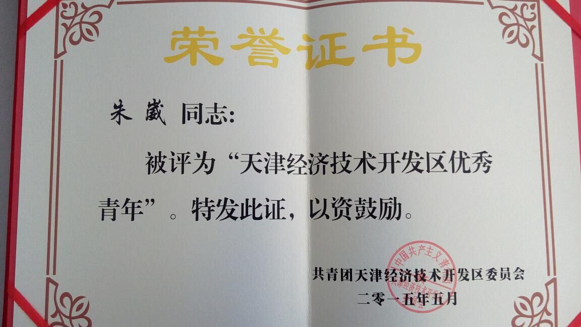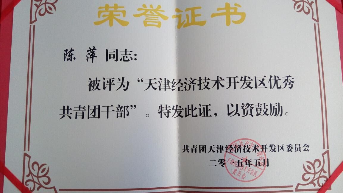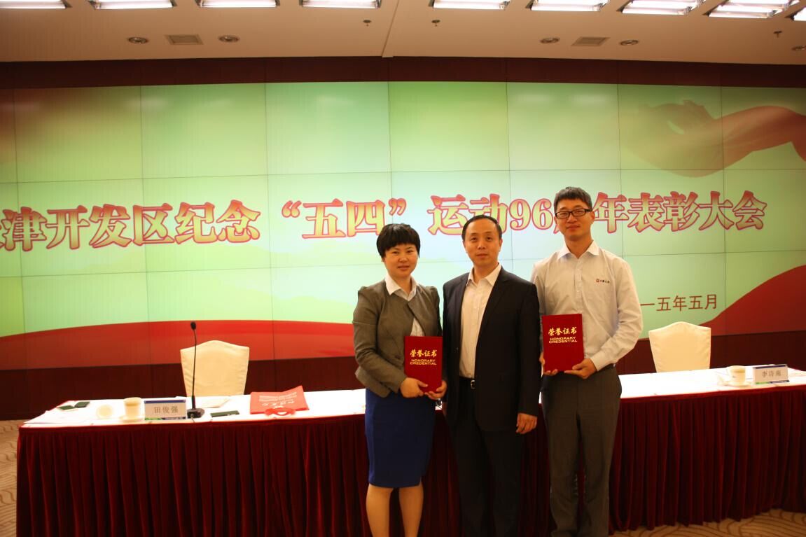2015年5月4日,在天津开发区纪念“五四”运动96周年表彰大会上,押球官网平台总经办主任陈萍、科研部朱崴分别荣获“天津经济技术开发区优秀共青团干部”、“天津经济技术开发区优秀青年”称号。天津开发区党委书记王盛、滨海新区团委书记黄东、天津开发区总工会主席田俊强、开发区团委书记李诗南等出席了会议并发表了主旨演讲。