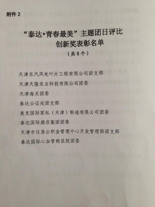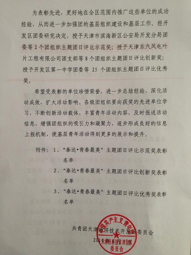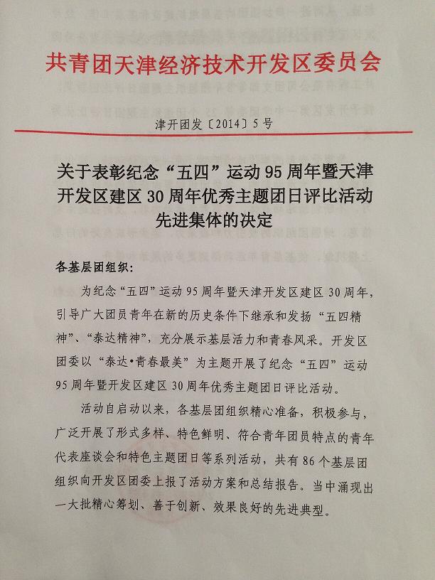 在天津开发区组织的“泰达●青春最美”主题团日评比活动中,押球官网平台团委组织的“五四”青年节押球官网平台活动参评,并荣获创新奖。