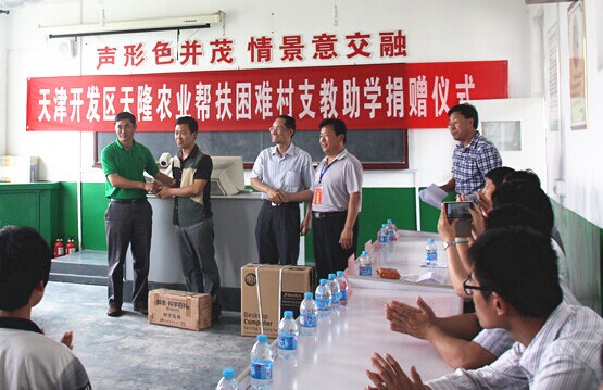 天津开发区管委会结对帮扶蓟县出头岭镇困难村驻村工作组的高文军组长,出头岭镇党委书记吴依军、副镇长杨丽云,天隆公司总经理杨飞博士、副总经理(党总支书记)杨春连、技术总监赵飞博士,以及天隆公司帮扶小组成员、镇中心校、东王官屯小学、景兴春蕾中学的学校领导、师生参加了本次捐赠活动。
