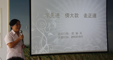 9月9日,公司在二楼培训室举办了《创业36条军规》押球官网平台讲座第四讲——“学先进 傍大款 走正道”,此次讲座由进出口部经理眭丽英主讲。